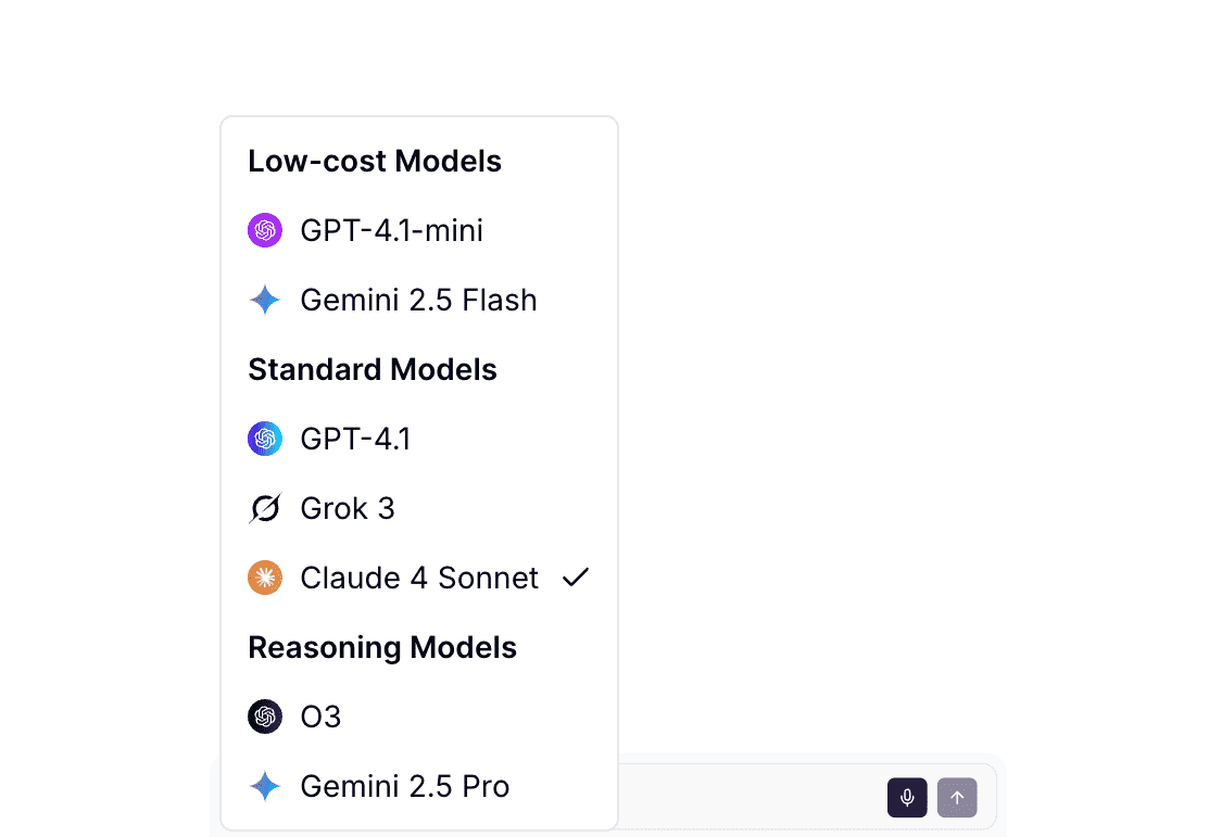 You can choose from top AI models, including GPT-5, GPT-5 Mini, O3, Gemini 2.5 Flash, Gemini 2.5 Pro, Claude 4 Sonnet, and Grok 3.
